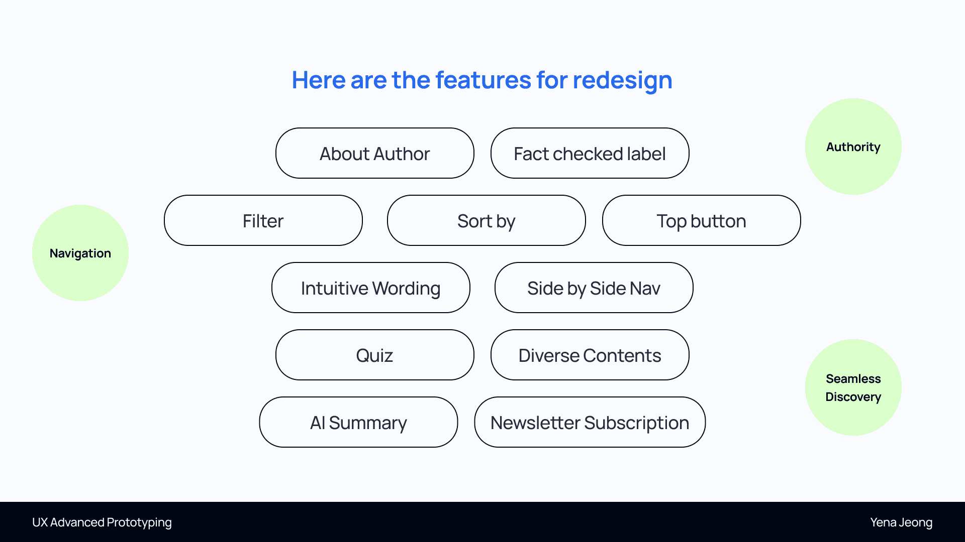 I have organized the necessary redesign features into three critical focus areas: Authority: Building trust by including the About Author Card and a Fact-Checked Label on articles. Navigation: Ensuring effortless exploration with Filter/Sort By options, a Floating "Top" Button for long articles, and Side-by-Side Nav to clearly connect the KB and the main site. Seamless Discovery: Driving deeper engagement through AI Summaries, Interactive Quizzes, and a Newsletter Subscription option.